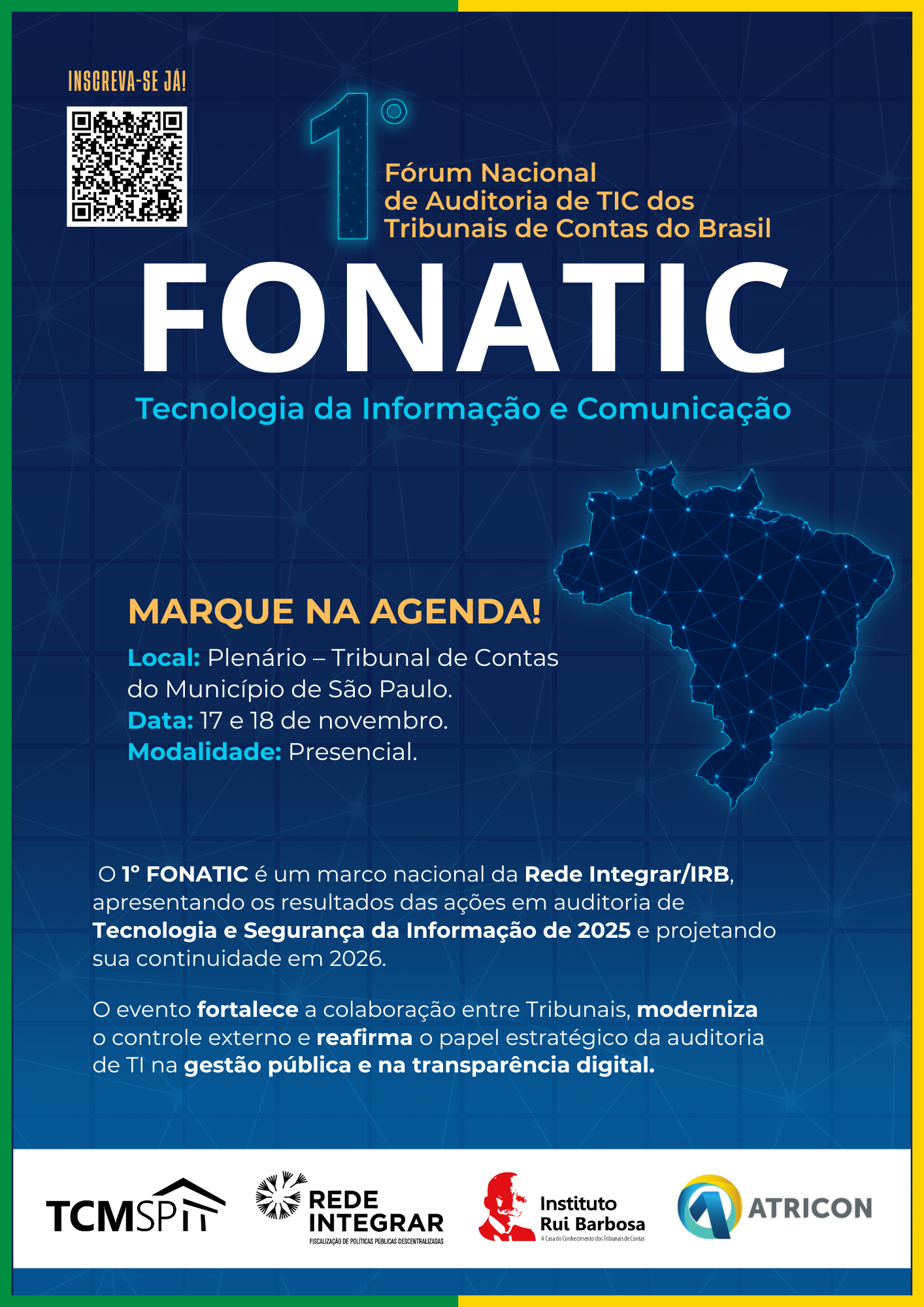 O Tribunal de Contas do Município de São Paulo (TCM-SP) promove, nos dias 17 e 18 de novembro, o 1º Fórum Nacional de Auditoria de Tecnologia da Informação e Comunicação dos Tribunais de Contas do Brasil (FONATIC). O evento presencial marca a conclusão das ações 43 e 46 da Rede Integrar, iniciativa do Instituto Rui Barbosa (IRB), com apoio da Associação dos Membros dos Tribunais de Contas do Brasil (Atricon).