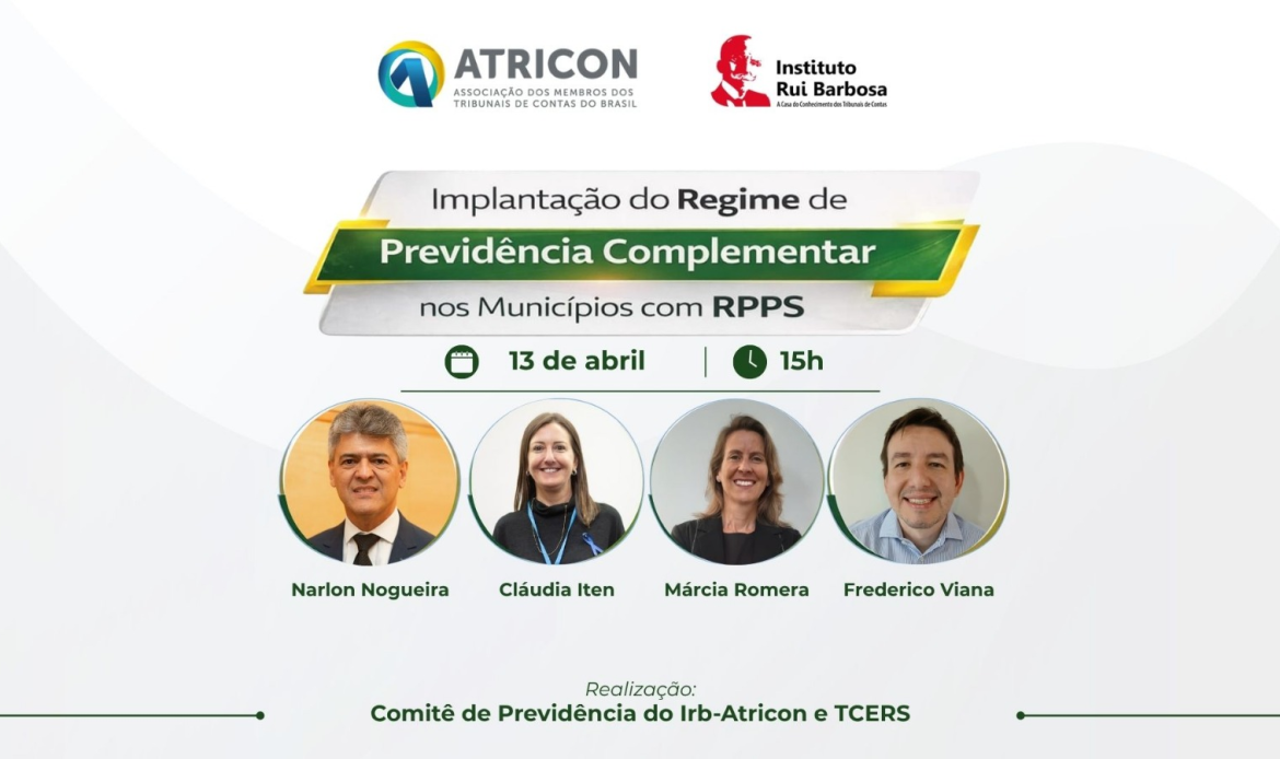 O Comitê de Previdência do Servidor Público IRB-Atricon irá realizar, em parceria com o Tribunal de Contas do Estado do Rio Grande do Sul (TCE-RS), no dia 13 de abril, a partir das 15h, o webinário “Implantação do Regime de Previdência Complementar nos Municípios com Regimes Próprios de Previdência Social (RPPS). Interessados podem se inscrever por meio do link abaixo.