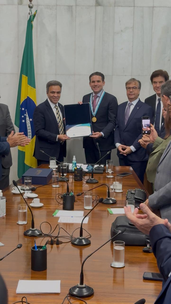 O presidente da Câmara dos Deputados, Hugo Motta, e o presidente da Frente Mista pela Transparência Pública, deputado Acácio Favacho, foram agraciados, nesta terça-feira (4), com o Colar do Mérito Ministro Miguel Seabra Fagundes. A homenagem ocorre em reconhecimento às relevantes contribuições de ambos para a aprovação da PEC da Essencialidade dos Tribunais de Contas.