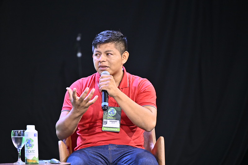 O segundo a falar foi Fernando Luiz Jacó Júnior, indígena da etnia Macuxi e presidente da Associação de Agricultores Familiares Indígenas da Comunidade Jabuti, no município de Bonfim. Ele apresentou o modo de vida da comunidade e os desafios enfrentados pela agricultura tradicional. “A gente percebeu que a mata estava diminuindo, que a terra estava ficando ácida e que a comida já não dava mais. Então nos reunimos e decidimos parar as queimadas. A terra precisava respirar”, contou.