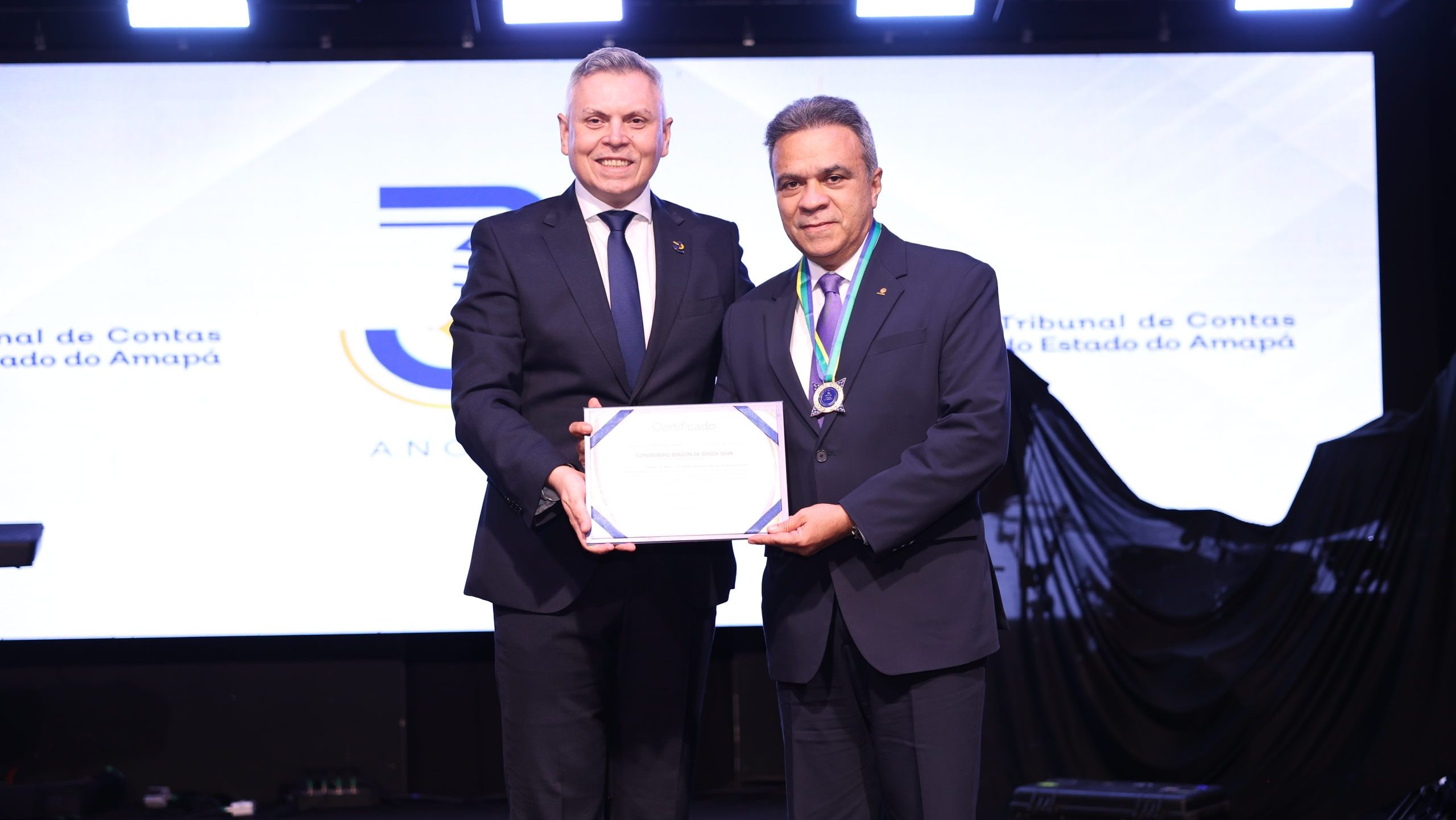 O presidente da Associação dos Membros dos Tribunais de Contas do Brasil (Atricon), Edilson Silva, foi agraciado, nesta quarta-feira (11), com a Medalha de Mérito Conselheira Margarete Salomão de Santana Ferreira, nomeada em homenagem à primeira presidente do Tribunal de Contas do Estado do Amapá (TCE-AP). Na ocasião também foram agraciados gestores, servidores e instituições que tenham prestado serviços ao Tribunal, ao estado do Amapá e ao país. Os conselheiros do TCE-AP e os procuradores-gerais de contas no Ministério Público de Contas (MPC) foram homenageados com Medalhas de Mérito de Contas.