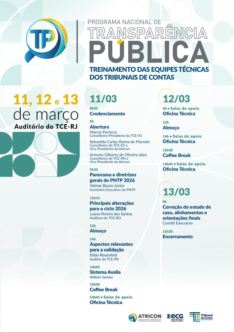 O Tribunal de Contas do Estado do Rio de Janeiro (TCE-RJ) sediará, nos dias 11, 12 e 13 de março, o Treinamento Nacional das Equipes Técnicas dos Tribunais de Contas para o ciclo de 2026 do Programa Nacional de Transparência Pública (PNTP). O evento contará com a presença de representantes dos 33 TCs brasileiros que, posteriormente, irão capacitar todos seus jurisdicionados.