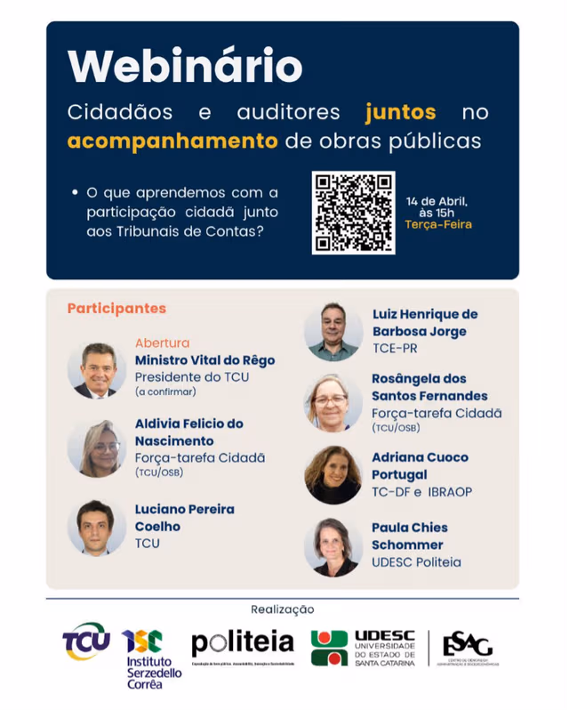 “No primeiro webinário desta série, falamos sobre por que a participação cidadã é estratégica para o controle externo. A partir de exemplos das instituições presentes, ficou evidente que a colaboração entre cidadãos e auditores ajuda a desenhar as auditorias, a orientar o controle para as prioridades das pessoas e a melhorar os serviços públicos e o uso dos recursos. No segundo webinário, vamos olhar em detalhes para a prática da colaboração no acompanhamento de obras públicas, desde a identificação dos problemas e o planejamento das auditorias até o monitoramento na ponta, em diversas regiões do país. O que nos permitirá entender sobre as condições para que a colaboração aconteça e produza resultados, ainda que enfrente muitos desafios.”